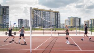 ملاعب الكرة الطائرة الخارجية: بأرضيات مقاومة للعوامل الجوية وأعمدة من الفولاذ المقاوم للصدأ.